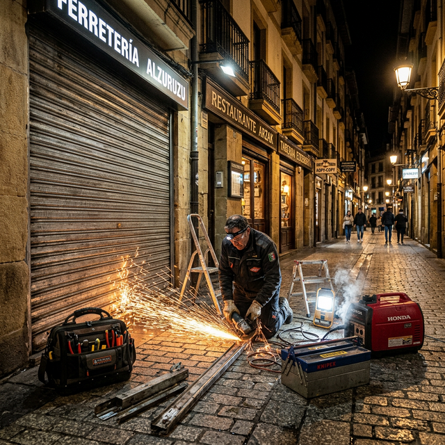 Nuestros técnicos llevan en sus unidades móviles herramientas específicas para cerraduras comerciales: cerraduras de gorjas (muy comunes en locales antiguos de la Parte Vieja), cerraduras multipunto de puertas de aluminio y PVC (habituales en locales de nueva construcción en Amara Berri), y persianas enrollables de todo tipo. En la mayoría de casos, tu local estará operativo en menos de 30 minutos desde nuestra llegada.
